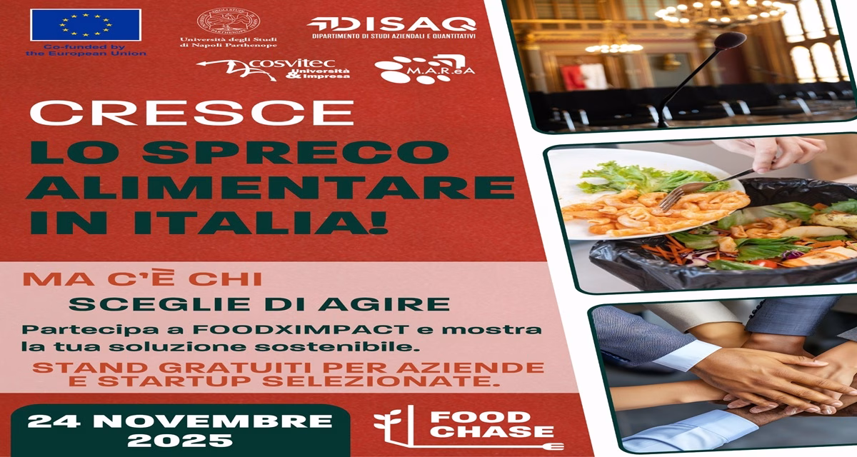 Lunedì 24 novembre 2025, presso Villa Doria d’Angri a Napoli, villa neoclassica, si terrà FoodXImpact, un evento che mette al centro il futuro del cibo, la sostenibilità e la riduzione dello spreco alimentare. Organizzato dall’Università degli Studi di Napoli Parthenope, in collaborazione con Cosvitec Università & Impresa e Marea Scarl, l’appuntamento riunirà imprese, ricercatori, studenti e istituzioni in una giornata di confronto, idee e networking.
